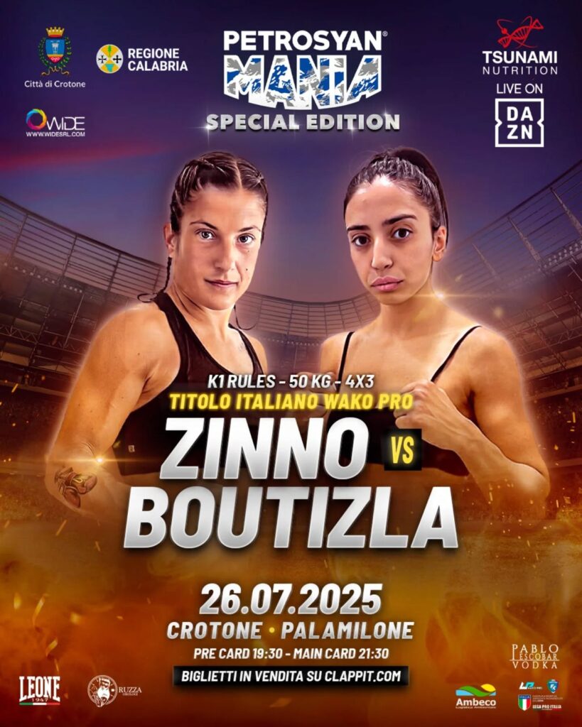 La giovane promessa della kickboxing italiana Hiba Boutizla è pronta a scrivere una nuova pagina della sua carriera: il prossimo 26 luglio, a Crotone, farà il suo debutto ufficiale tra i professionisti sfidando Eleonora Zinno per il titolo italiano PRO nella categoria -50 kg, in occasione dell’evento internazionale Petrosyanmania. L’incontro sarà trasmesso in diretta su DAZN.
